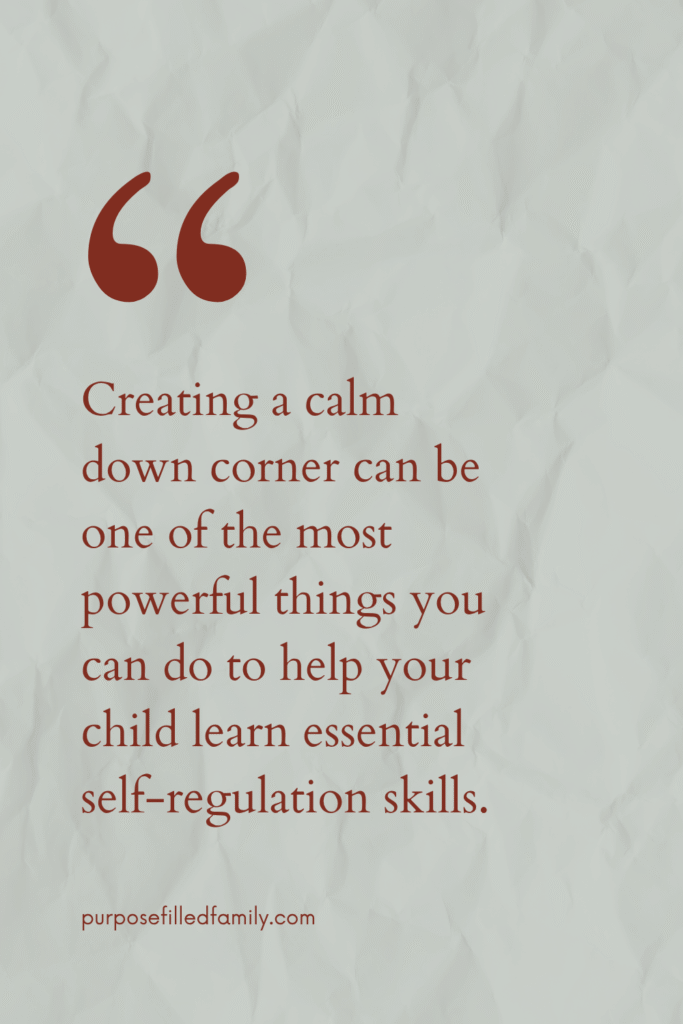 Creating a calm down corner doesn’t have to be overwhelming and it can be one of the most powerful things you can do to help your child learn essential self-regulation skills that they will need for the rest of their lives.